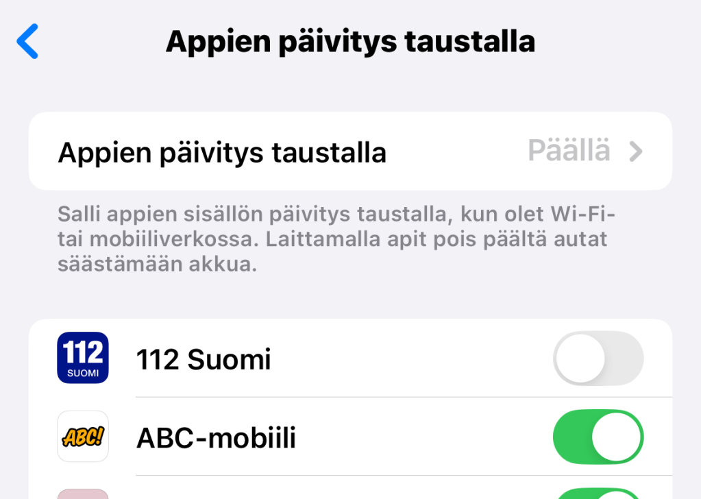Myös Apple suosittelee rajaamaan vain tarvittaville ohjelmille oikeuden taustapäivitykseen akun säästämisen nimissä (ohjeteksti asetusvalikossa).