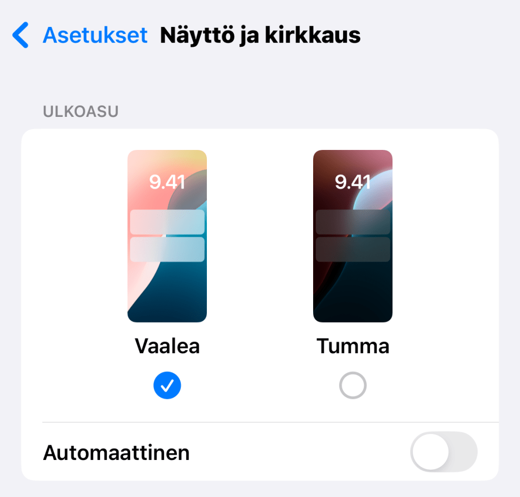 Voit vaihtaa teeemaa menemällä Asetukset > Näyttö ja kirkkaus > Tumma.