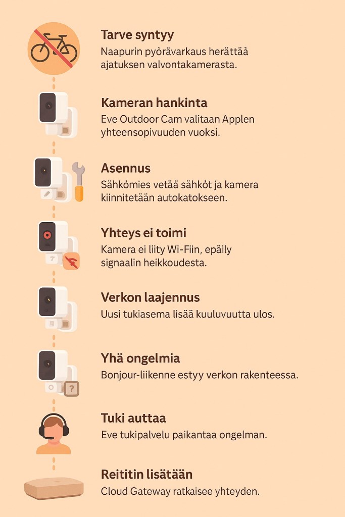 Naapurin autokatoksesta varastettiin polkupyörä. Oli kuulemma vaijereilla hyvin kiinni. Heillä ei ollut valvontaa katoksessa. Ei meilläkään ollut tuolloin, mutta nyt on: Apple-yhteensopiva, ulkokäyttöön soveltuva valvontakamera. Kerron kokemukset asentamisesta sekä itse kamerasta. Ei nimittäin ollut aivan helppoa saada laitetta toimintakuntoon. Eikä sähkömiehen työt olleet edes se hankalin osuus.